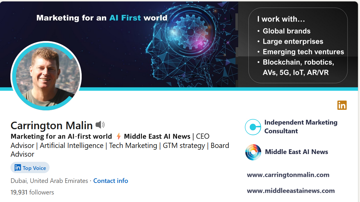 Carrington Malin is a UAE-based marketing and communications professional, consultant, entrepreneur and writer with many years experience of building brands, driving growth and leading high-performance teams. He has worked with a wide range of high-growth, technology and tech-driven ventures across ecommerce, consumer products, digital services, B2B, media, software, hardware and other sectors. These days he focuses mainly on emerging technology ventures related to artificial intelligence (AI), augmented reality (AR) / virtual reality (VR), blockchain, drones, Internet of Things (IoT), robotics and smart cities.