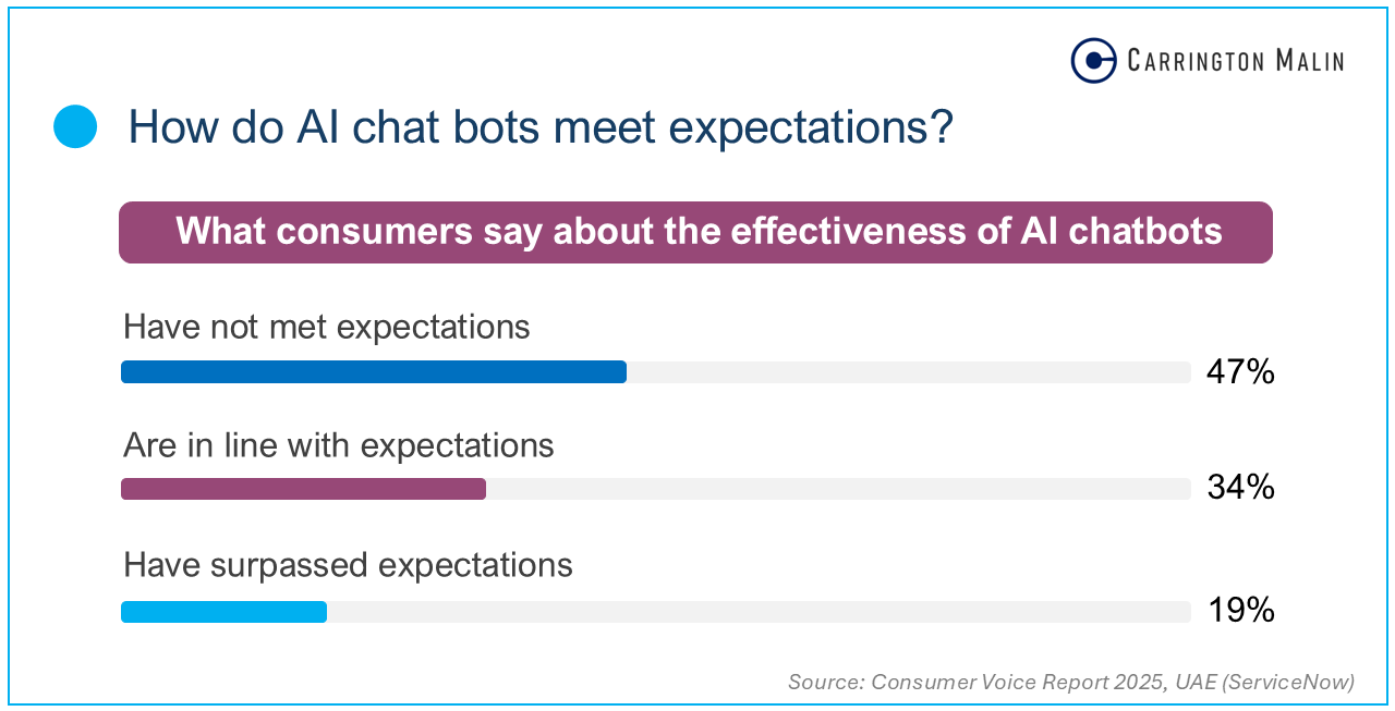 In the same survey 34% said that the effectiveness of AI chatbots had met their expectations, and encouragingly 19% said that effectiveness had exceeded their expectations. The fact remains though, that if almost half of your customers believe that you have failed to meet expectations, you have do have problems!