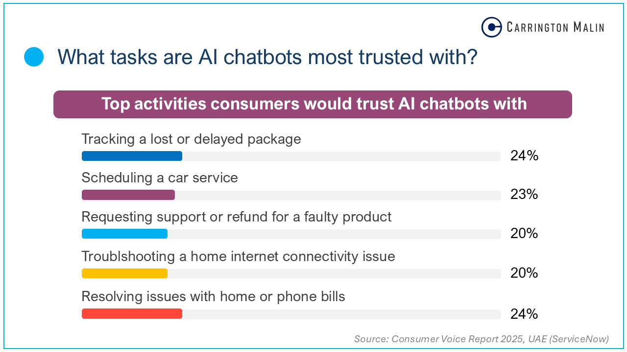 This is an issue of trust. In the same survey, people were asked what they would trust an AI chatbot with. The most popular answer was ‘Tracking a lost or delayed package’, but with only 24% of respondents admitting that this is something they would trust a chatbot to do.